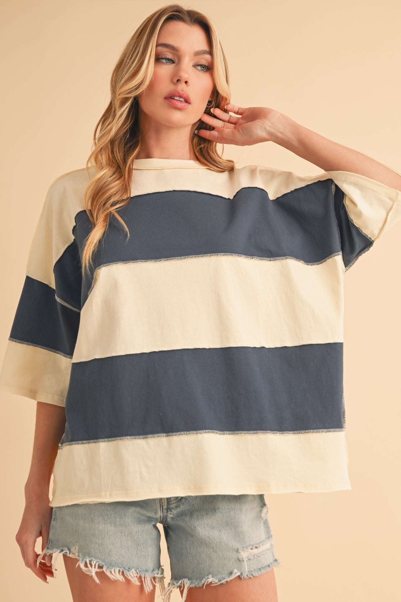 The Polly Color Block Top combines a relaxed fit with bold color and cream stripes, highlighted by exposed seams for an effortless, casual style. Its oversized silhouette and breathable design provide comfort and versatility, making it ideal for pairing with denim or leggings for a chic, easygoing look.